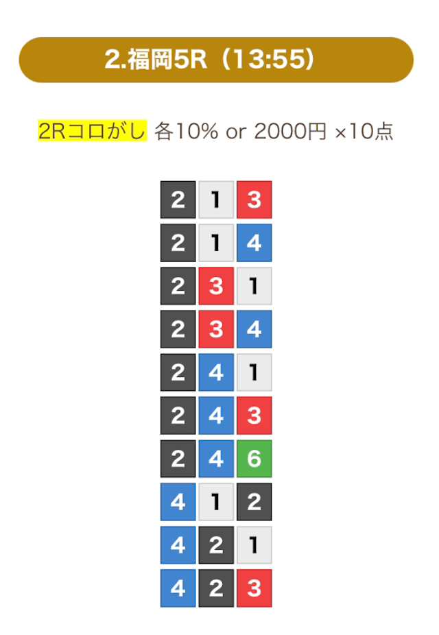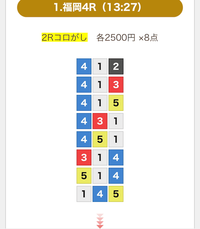 | 10月23日福岡05R | 1-2-5 | 8,000円 | 13,500円 | 169% | |