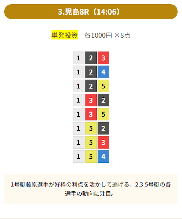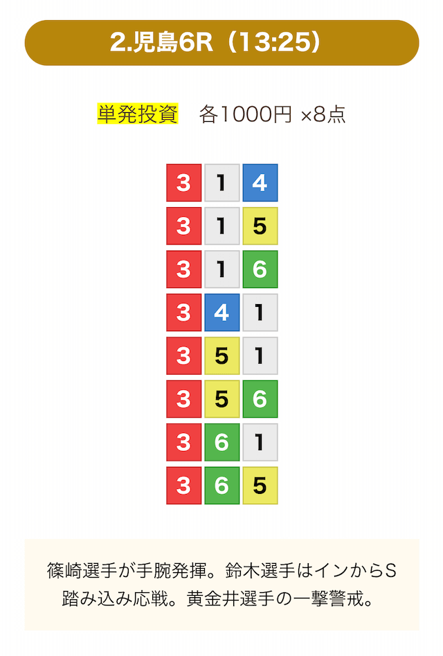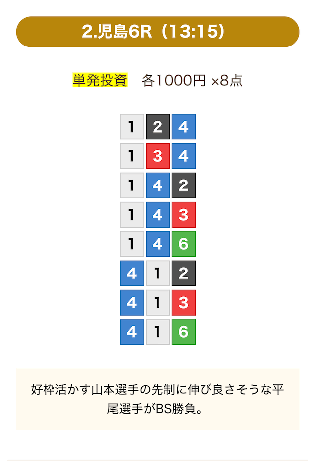 | 12月29日児島06R | 4-1-6 | 8,000円 | 28,700円 | 359% | |