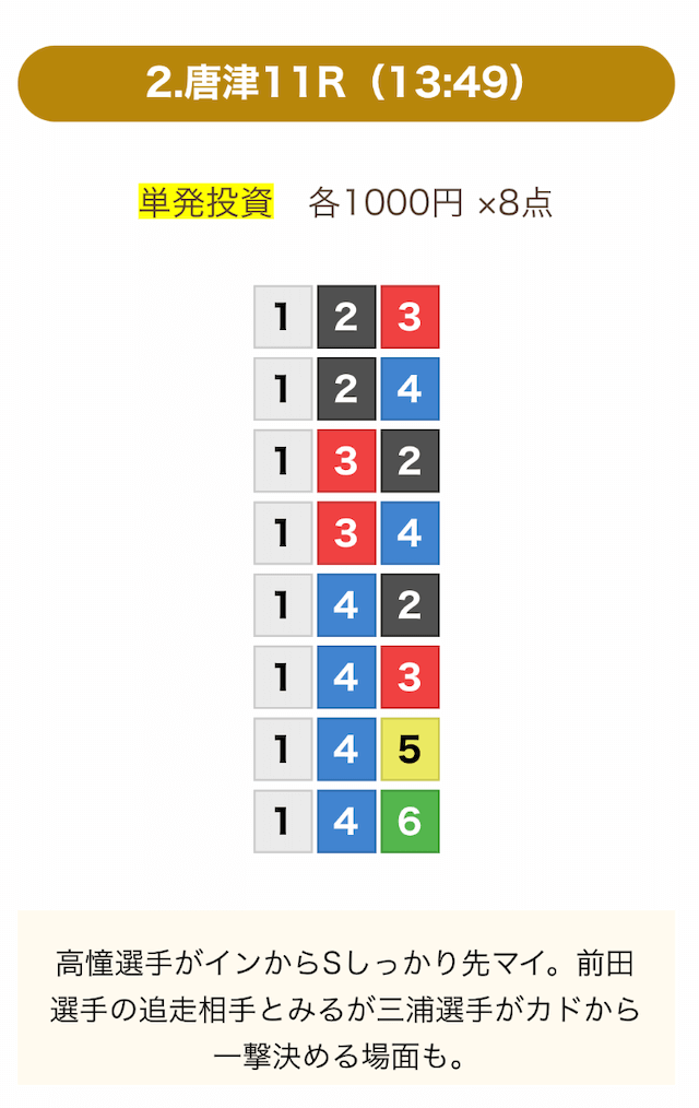 | 12月15日福岡09R | 1-4-6 | 8,000円 | 20,200円 | 253% | |