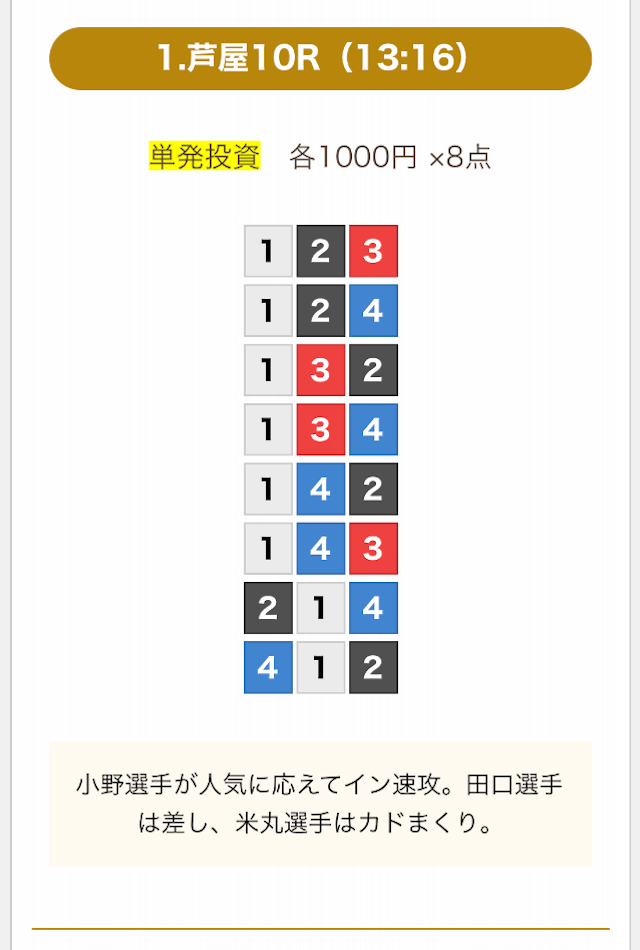 | 10月14日芦屋10R | 1-3-2 | 8,000円 | 10,300円 | 129% | |