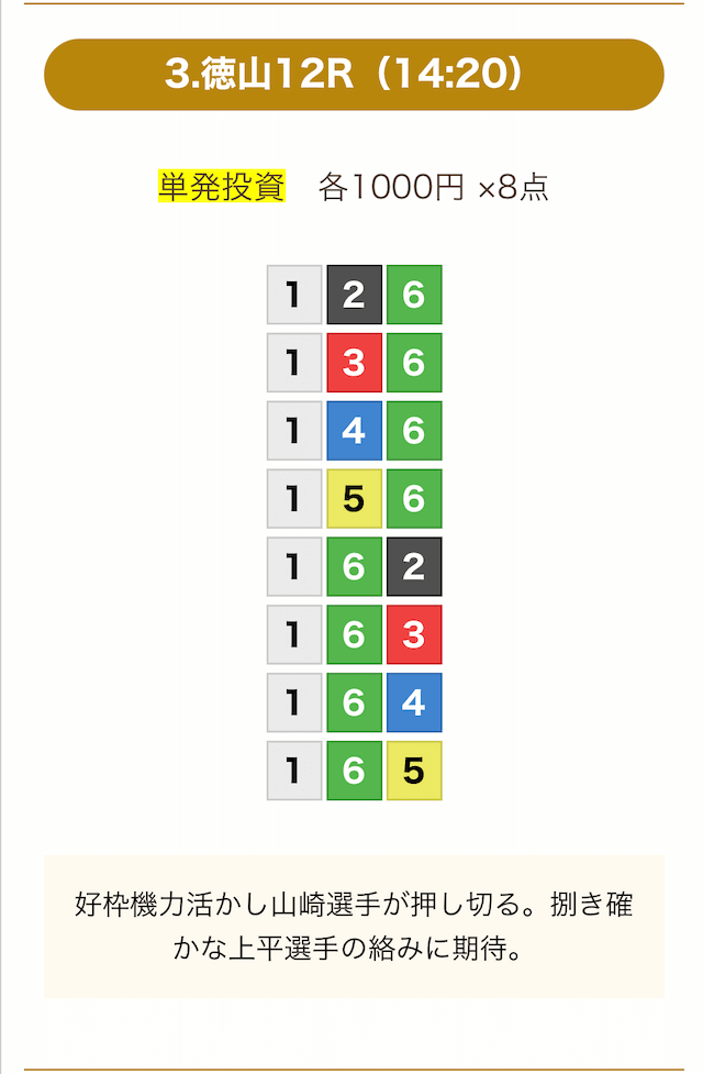 | 10月15日徳山12R | 1-2-6 | 8,000円 | 14,500円 | 181% | |