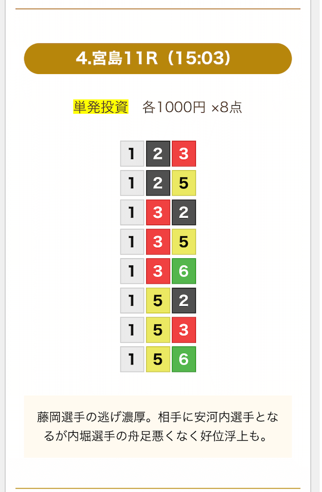 | 10月22日宮島11R | 1-3-6 | 8,000円 | 13,300円 | 166% | |