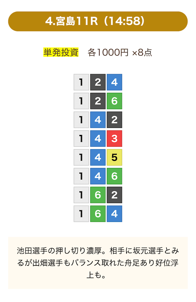 | 12月12日宮島11R | 1-6-4 | 8,000円 | 43,200円 | 540% | |