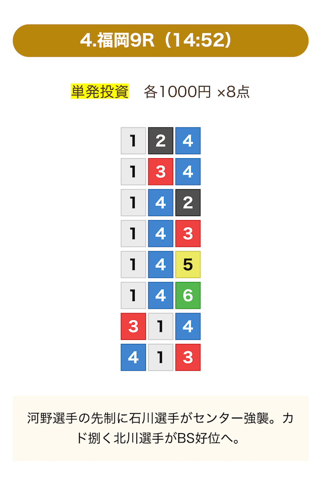 | 11月11日福岡09R | 1-4-2 | 8,000円 | 16,100円 | 201% | |