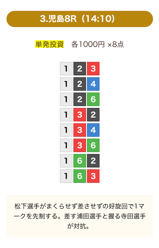 | 03月15日児島06R | 1-3-2 | 8,000円 | 8,300円 | 104% | |