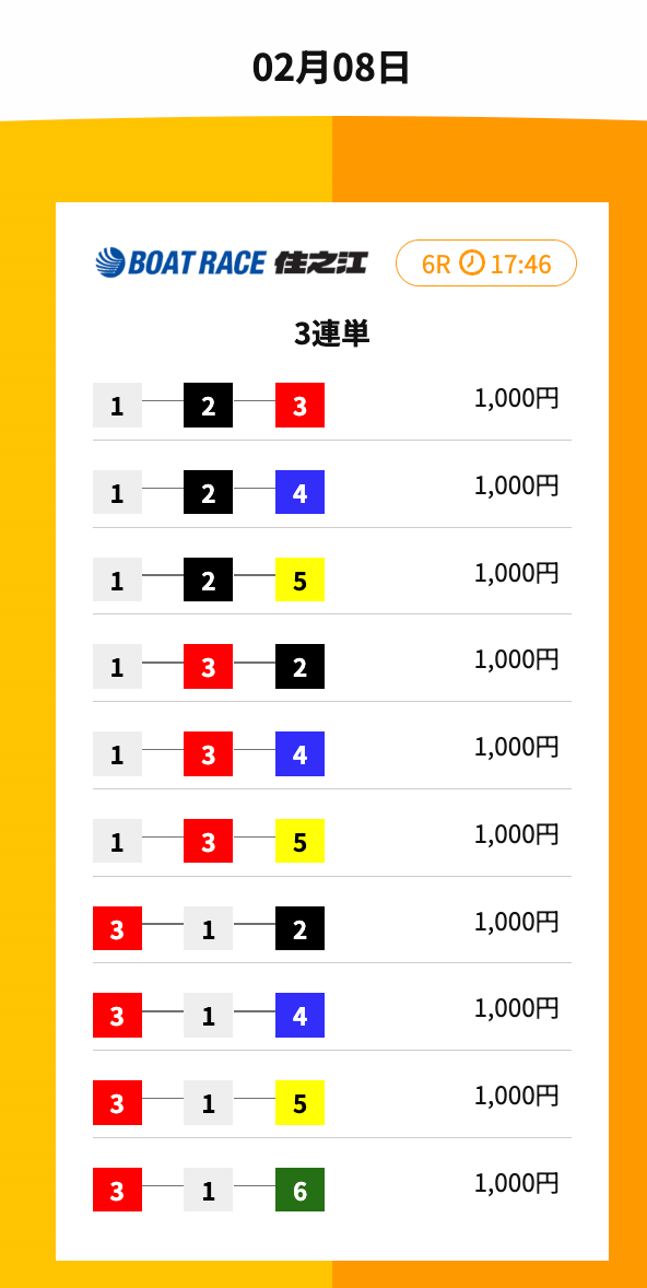 | 軸選択 | 1号艇 | 2号艇〜6号艇 |