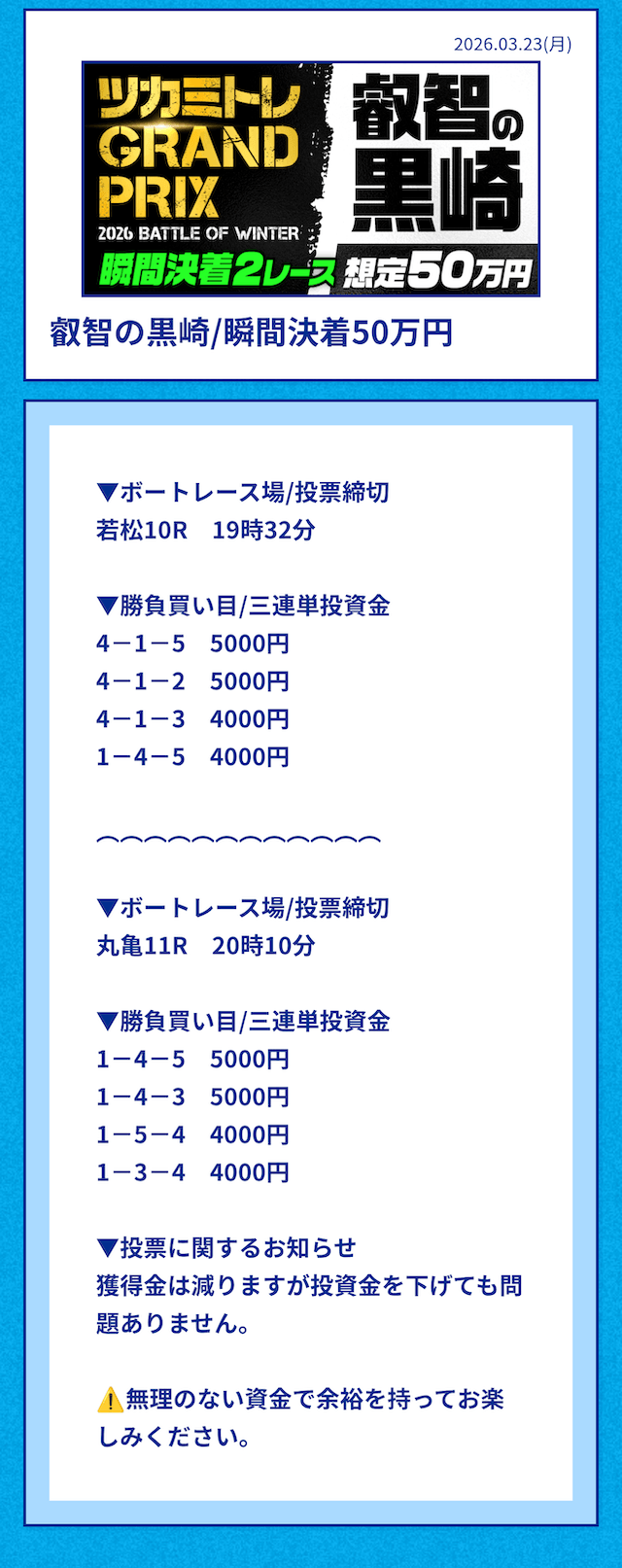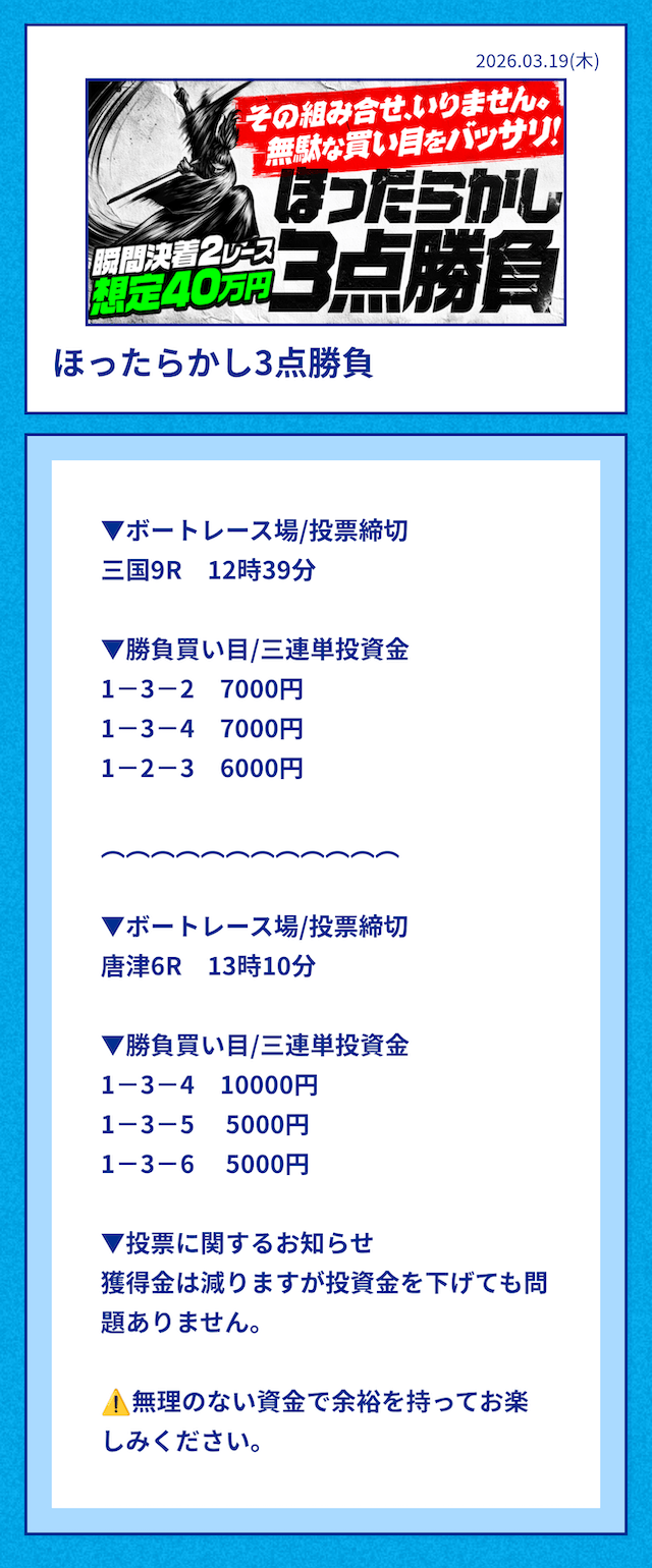 | 3号艇 | 節間成績が悪く、展示もよくないため点数を減らすのなら切っても問題ない。 |