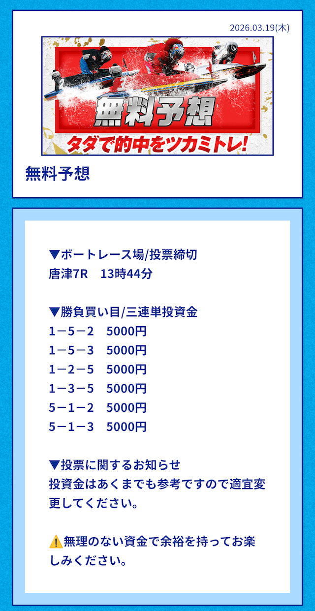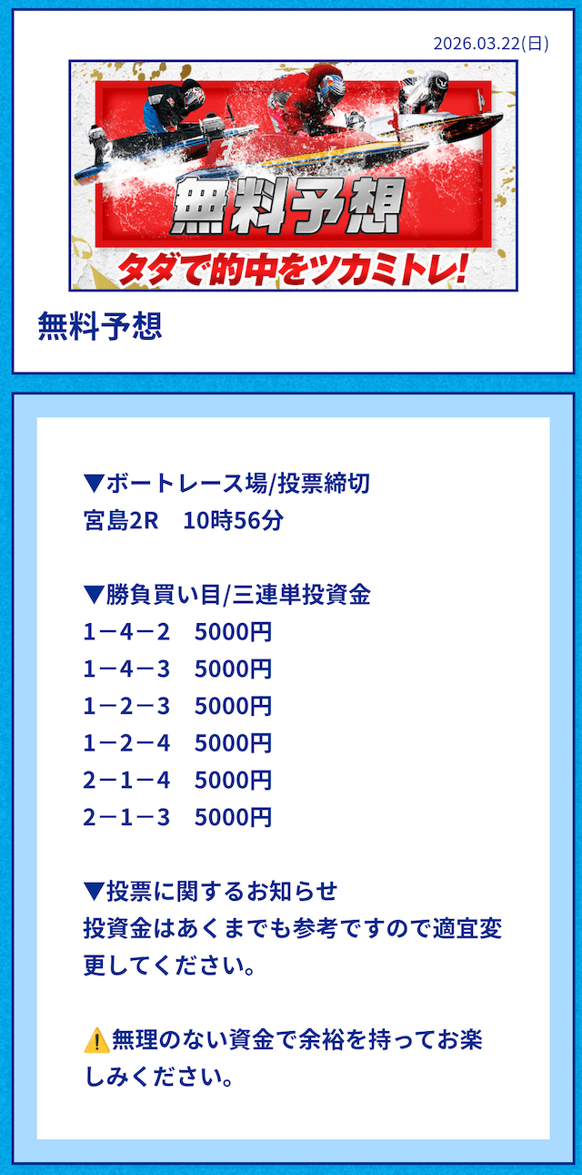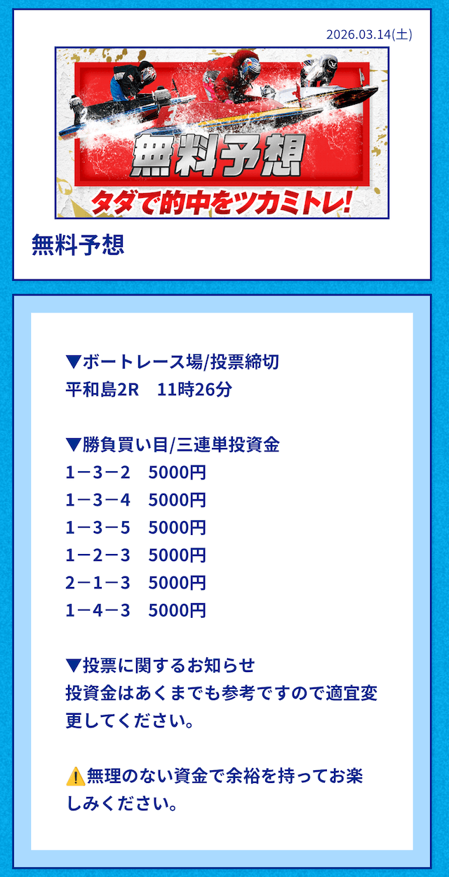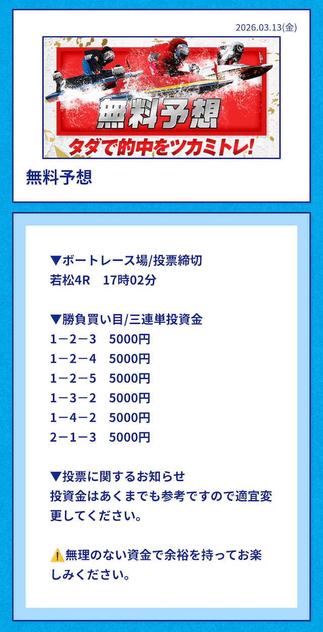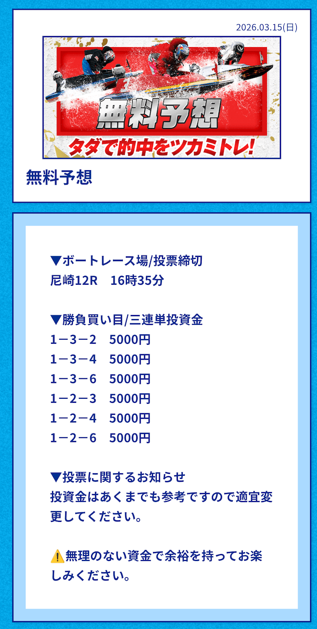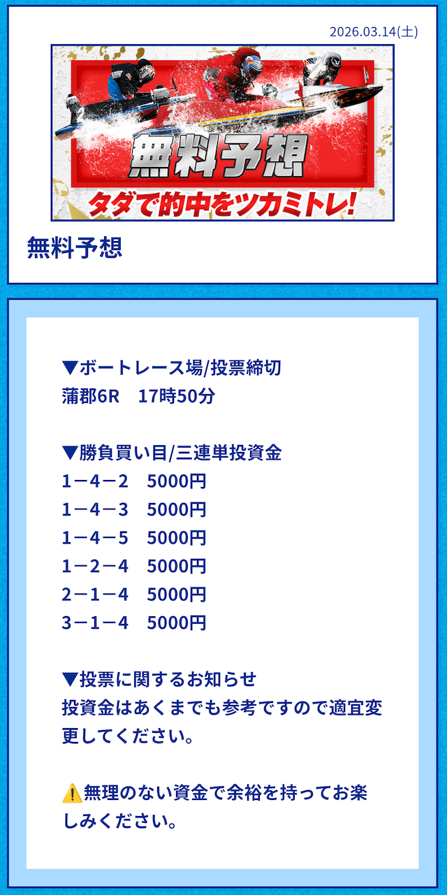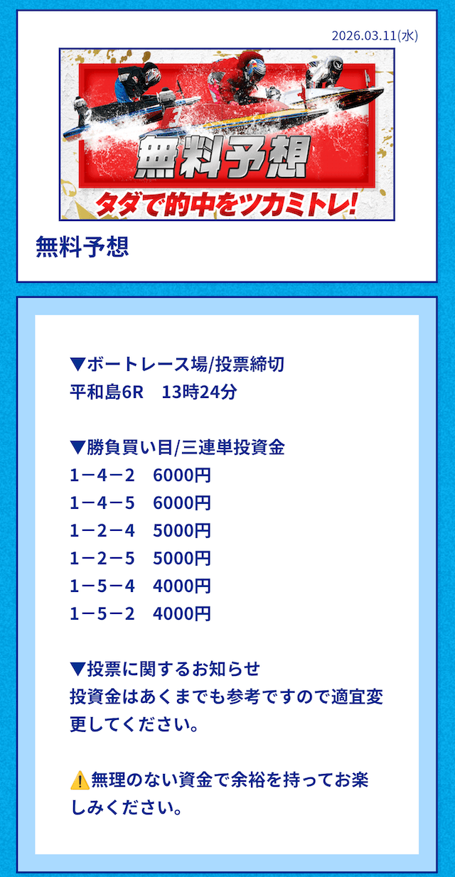 中には無料予想の舟券代30,000円から勝ち続け、一切追加投資をせずに稼いでいる方もいるようだ。