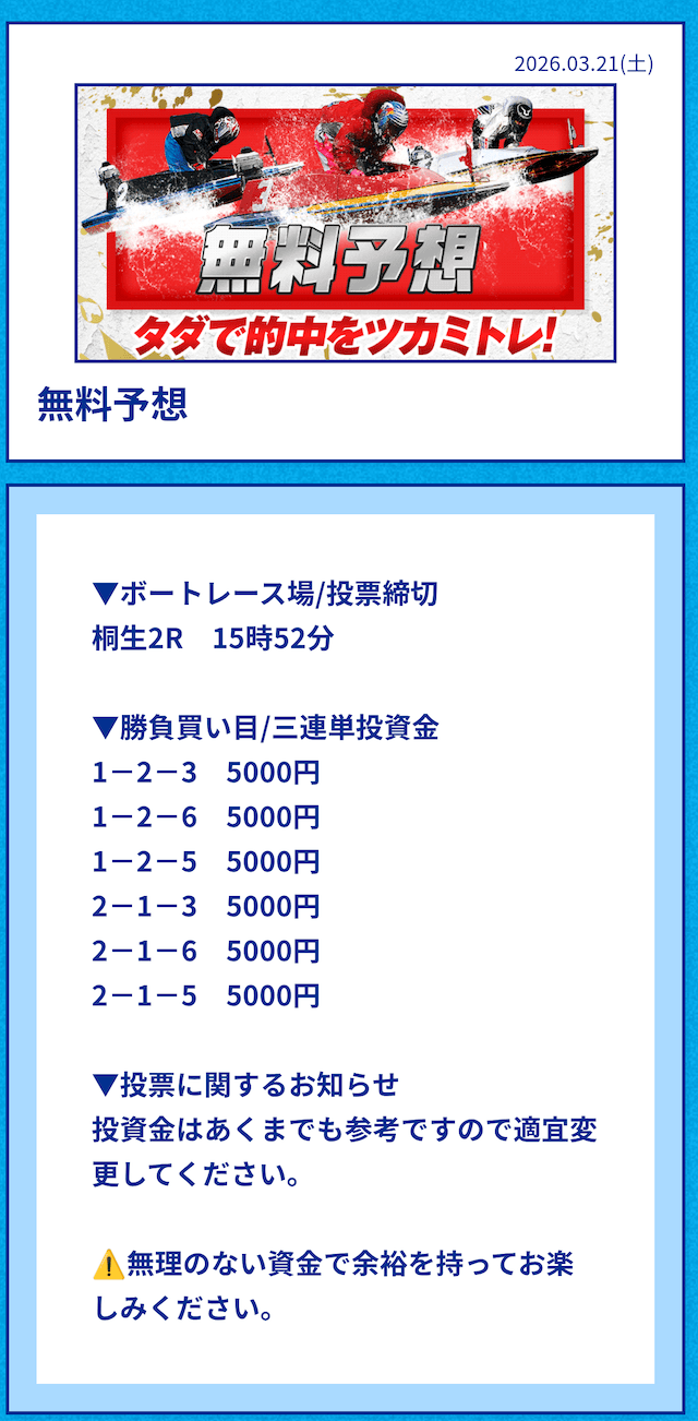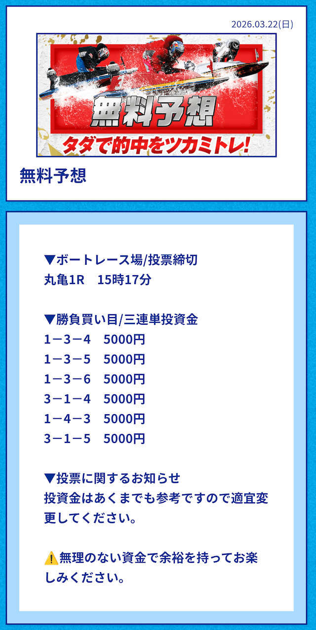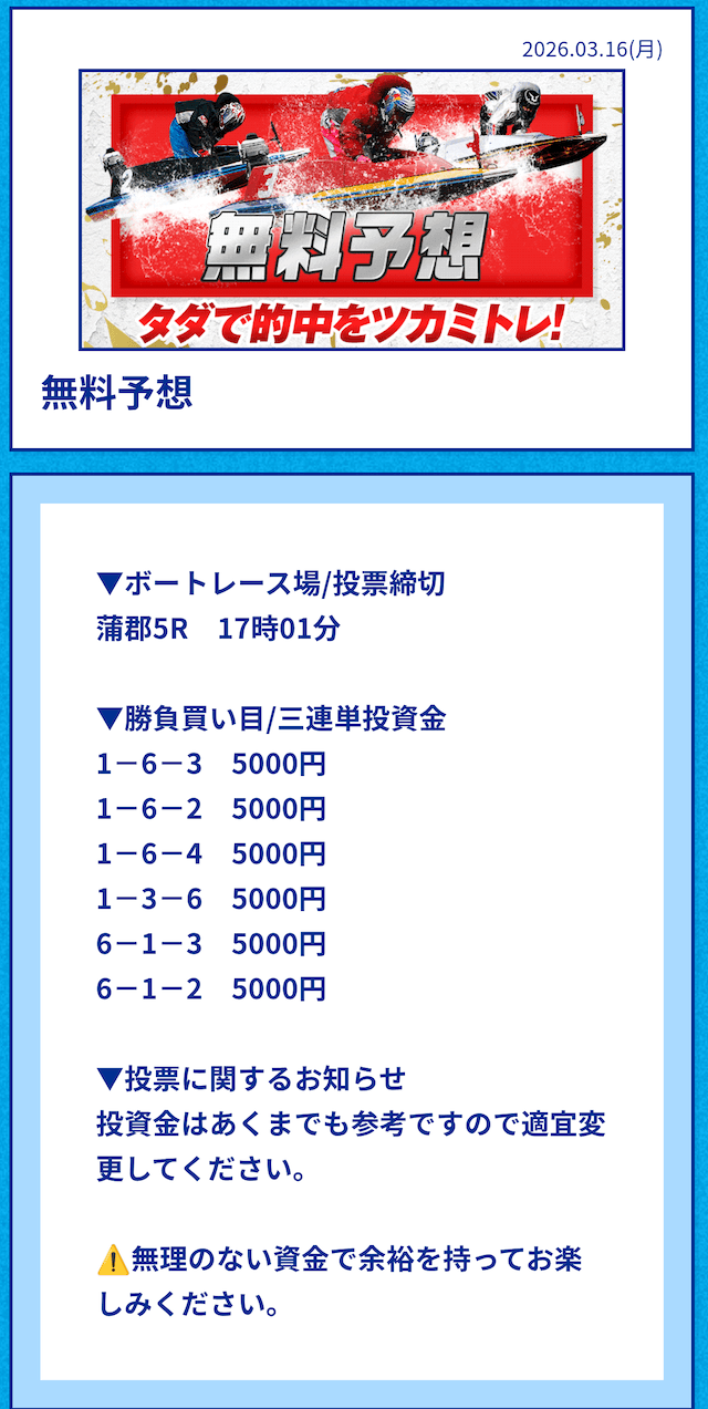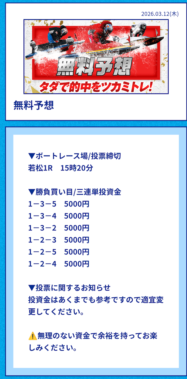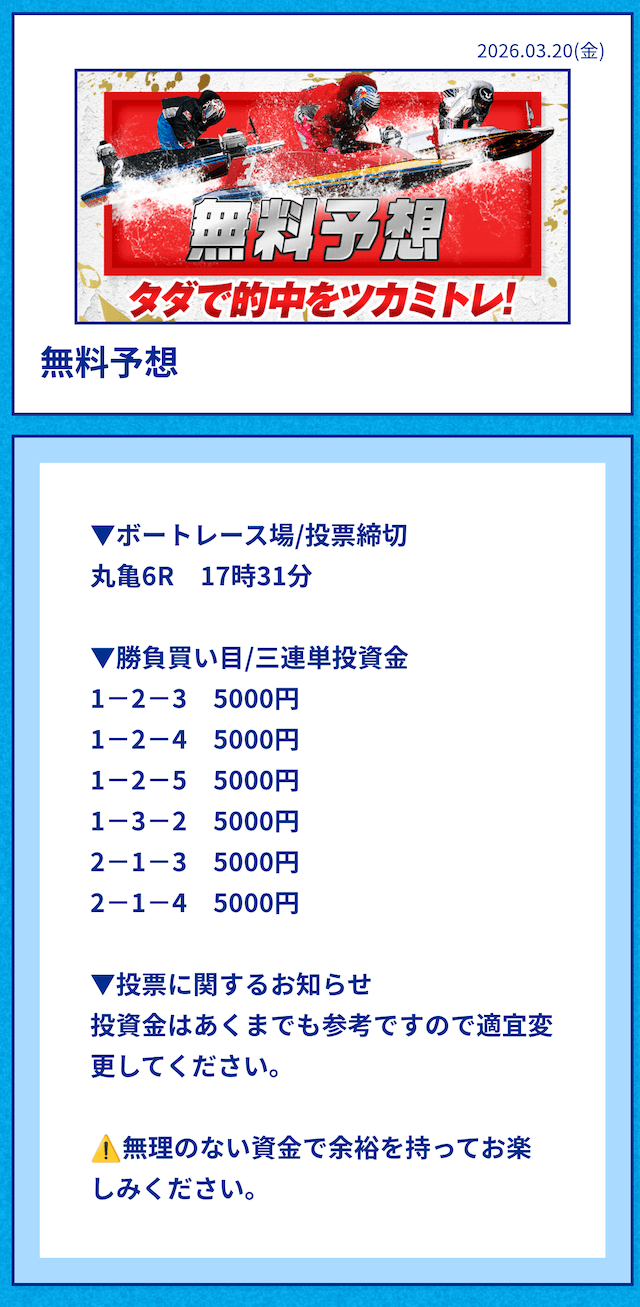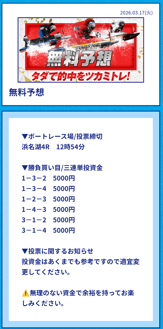 中には無料予想の舟券代30,000円から勝ち続け、一切追加投資をせずに稼いでいる方もいるようだ。