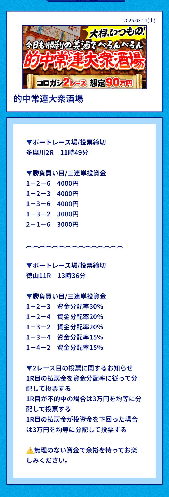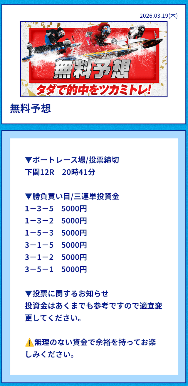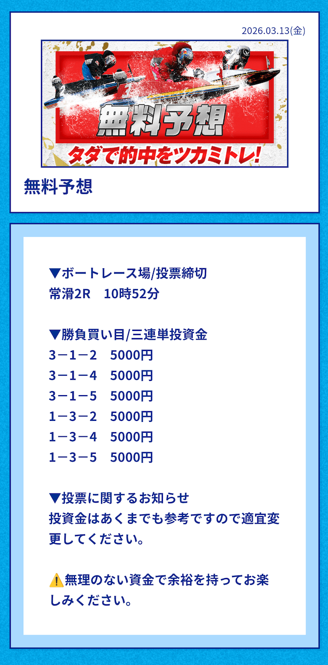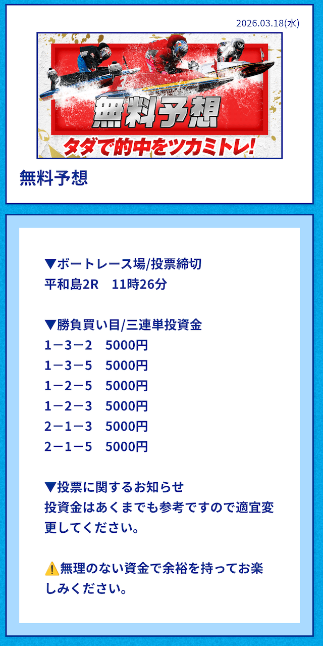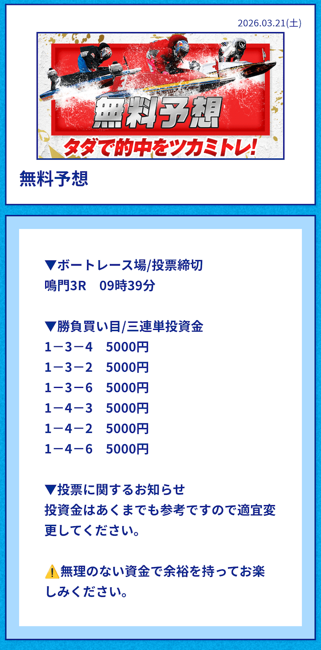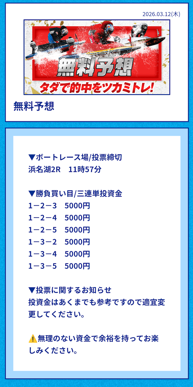 中には無料予想の舟券代30,000円から勝ち続け、一切追加投資をせずに稼いでいる方もいるようだ。