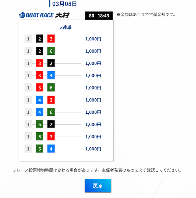 | 03月08日大村08R | 1-2-6 | 10,000円 | 11,200円 | 112% | |