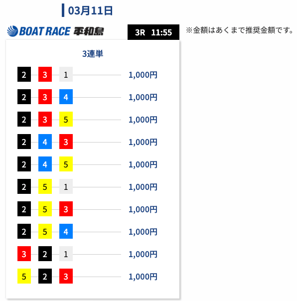 | 10月07日平和島03R | 1-2-4 | 10,000円 | 31,200円 | 312% | |
