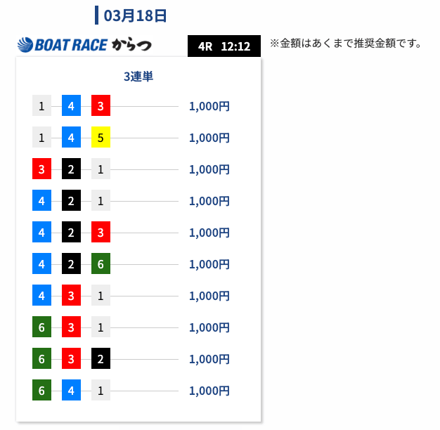 | 03月18日唐津04R | 3-2-1 | 10,000円 | 52,100円 | 521% | |