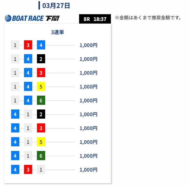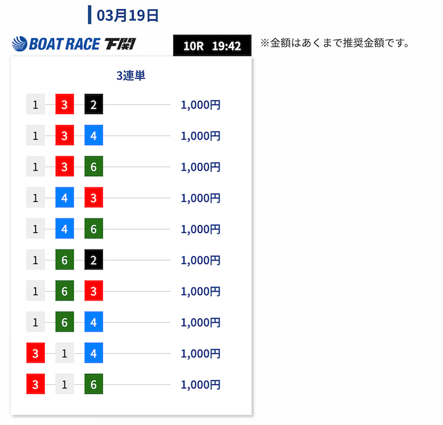 | 03月19日下関10R | 1-6-4 | 10,000円 | 22,300円 | 223% | |
