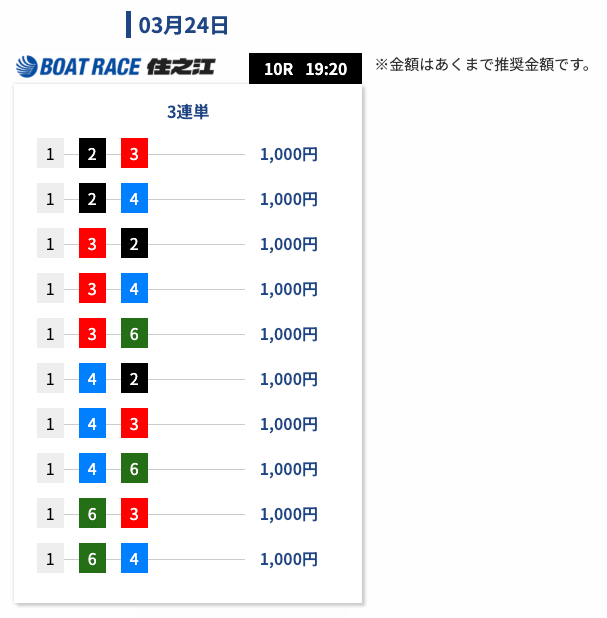 | 03月24日住之江10R | 1-4-6 | 10,000円 | 12,200円 | 122% | |