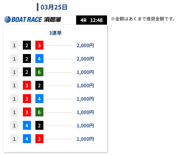 | 03月25日浜名湖04R | 1-2-3 | 10,000円 | 13,200円 | 132% | |