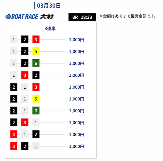 | 03月30日大村08R | 1-2-6 | 10,000円 | 14,000円 | 140% | |